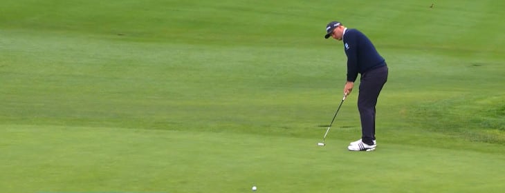 Trotz eines eingebunkerten Drives legt er sich auf der 14 dann aber die erste echte Birdiechance auf, lässt die große Möglichkeit aus zwei Metern jedoch ungenützt verstreichen. Immerhin kann er auf den darauffolgenden Bahnen erstmals sein Spiel einigermaßen stabilisieren. Erst kurz vor dem Turn droht es dann wieder unangenehm zu werden, nach Ungenauigkeiten im langen Spiel und einem Ausflug in den Grünbunker, chippt er von außerhalb des Grüns jedoch ein und kratzt so am Par 5 der 18 noch das Par.